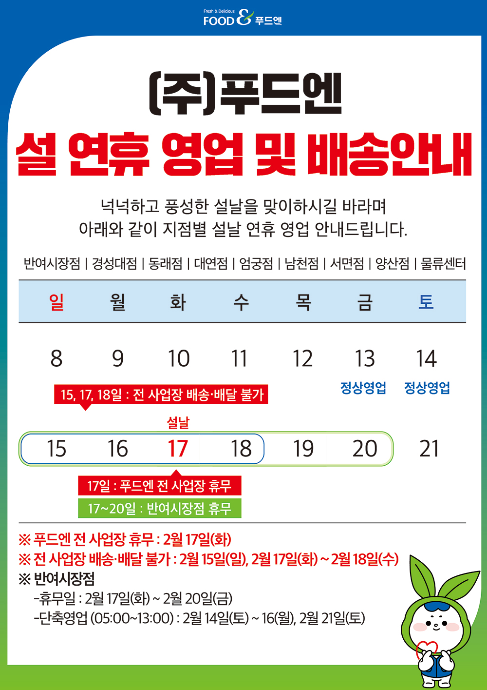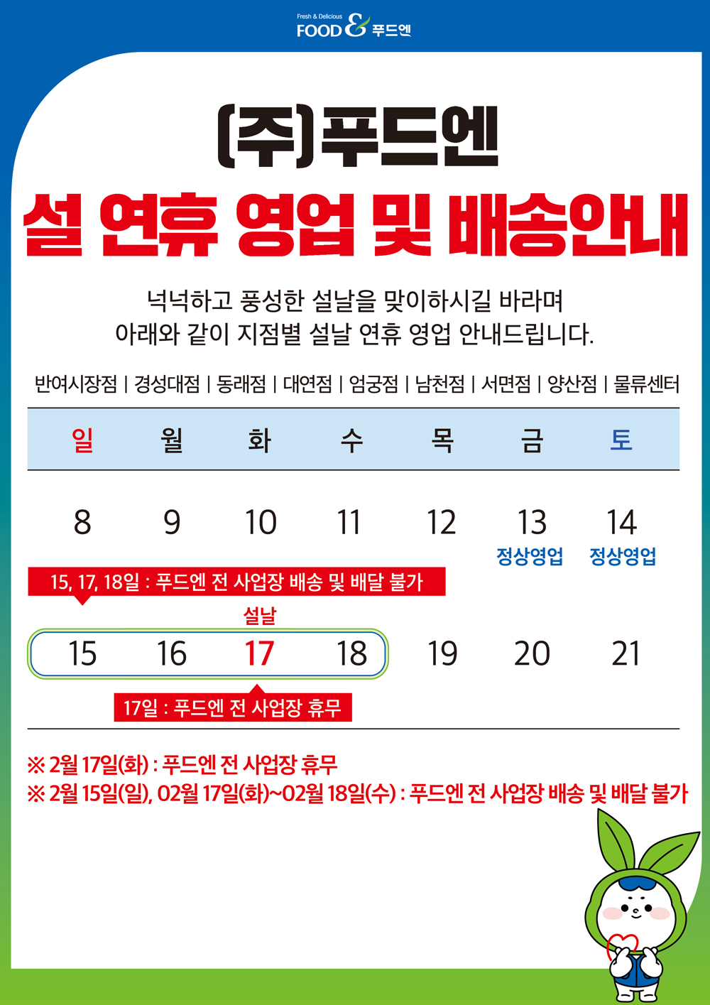 02월 15일(일), 02월 17일(화)~02월 18일(수) : 푸드엔 전 사업장 배송 및 배달 불가