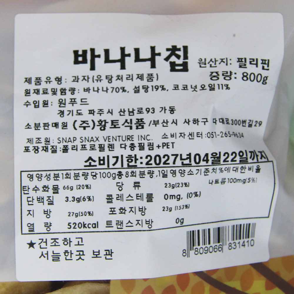 | 원재료명 및 함량(농수산물의 원산지 표시에 관한 법률에 따른 원산지 표시 포함) | 바나나70%,설탕19%,코코넛오일11% |