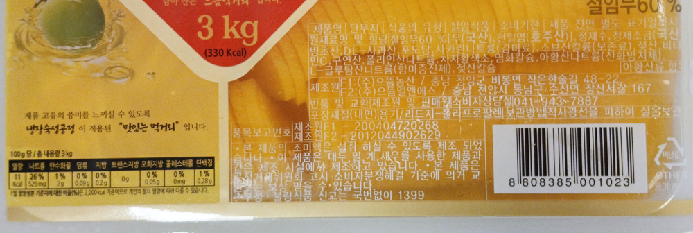 | 원재료명 및 함량(농수산물의 원산지 표시에 관한 법률에 따른 원산지 표시 포함) | 절임무60%[무(국산),식염],정제수,식염(국산),빙초산(합성식초),사과산,포도당,삭카린나트륨(합성감미료),소르빈산칼륨(합성보존료),젖산,비타민씨,구연산,폴리인산나트륨,치자황색소,염화칼슘,아황산나트륨(산화방지제),L-글루타민산나트륨(향미증진제) |