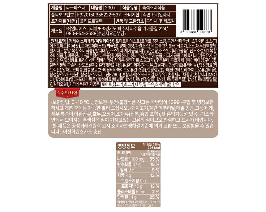 | 원재료명 및 함량(농수산물의 원산지 표시에 관한 법률에 따른 원산지 표시 포함) | 정제수,스파게티(이탈리아산),토마토페이스트(토마토,정제소금,구연산/미국산),스파게티소스{다이스토마토(미국산),토마토페이스트(외국산),양파,설탕,과일소스},비프불고기분쇄(쇠고기 소스,대두단백분말,탈지대두분말,복합조미식품),탈지대두,소스1,과채가공품,대두유,설탕,소스2,기타가공품1,산도조절제1,복합조미식품,향미증진제,L-글루탐산나트륨(향미증진제),정제소금,당류...등 상세설명참조 |