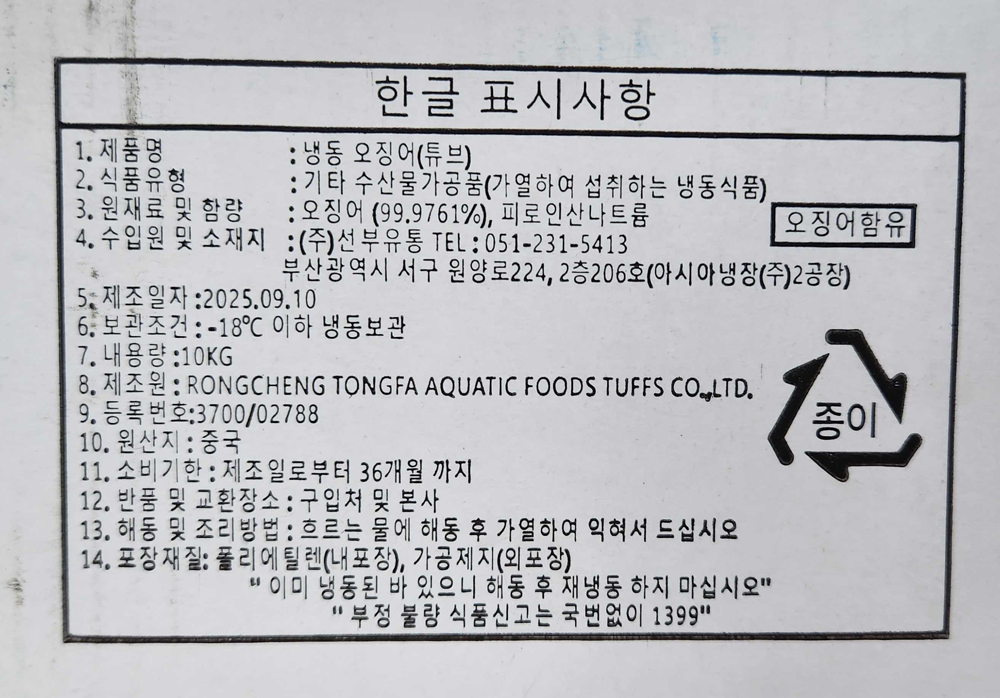 | 품목 또는 명칭 | 냉동 오징어(튜브오징어) 120-150 10kg/선부유통 |