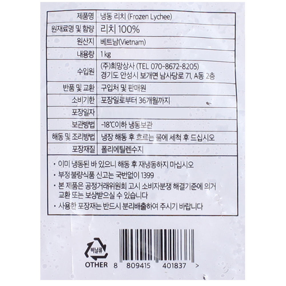 | 품목 또는 명칭 | 냉동 리치·1kg(베트남산)/대정 |