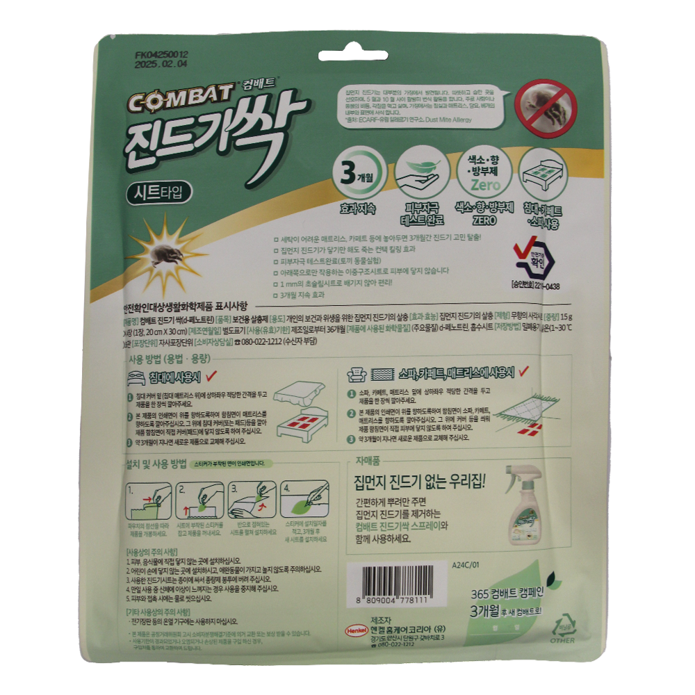 | 제품명 | 헨켈) 컴배트 진드기 싹(시트타입) 4개입 |
