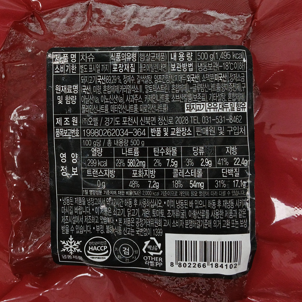 | 원재료명 및 함량(농수산물의 원산지 표시에 관한 법률에 따른 원산지 표시 포함) | 돼지고기(국산)89.29%, 정제수, 갈색설탕, 양조간장 등 |
