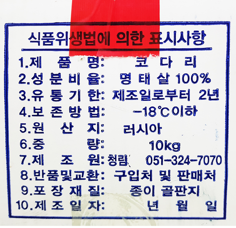 | 품목 또는 명칭 | 명태코다리(대) 10kg (70-80g 토막)/러시아산(청림수산) |
