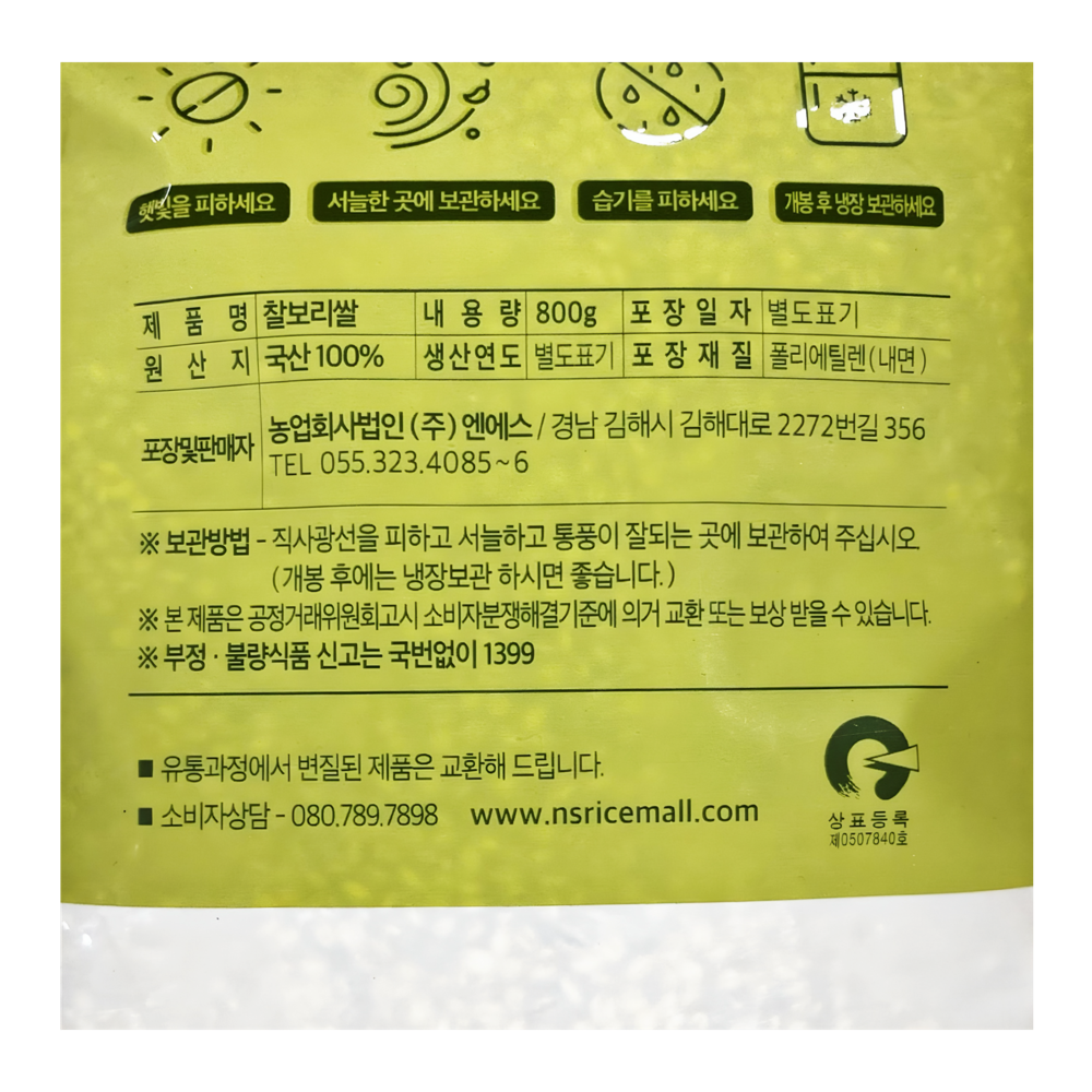 | 품목 또는 명칭 | 찰보리쌀·800g/엔에스 |