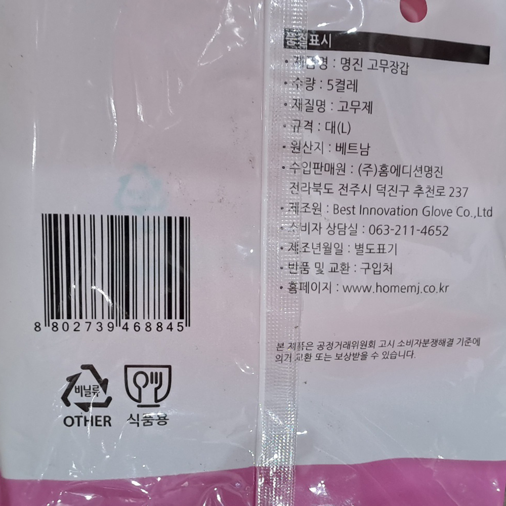 | 제품명 | 분홍 고무장갑 5입·L/명진 |