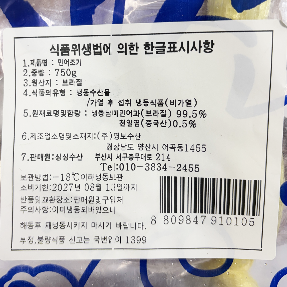 | 품목 또는 명칭 | 냉동 민어조기 5미 750g/브라질 |