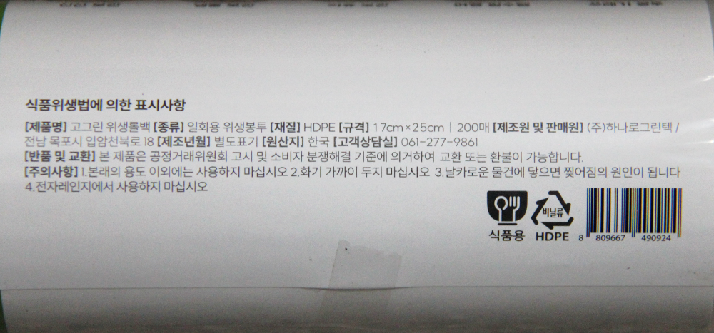 | 제품명 | 고그린 위생롤백 17*25(200매) /하나로그린텍 |