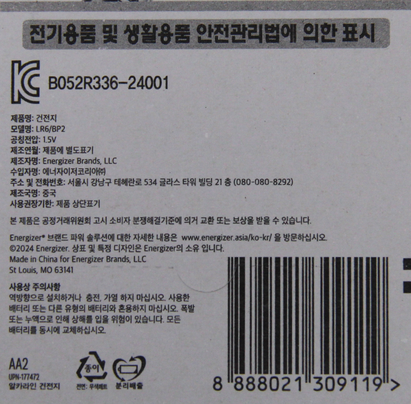 | 제품명 | NEW 에너자이저 AA 2P /알카라인건전지 |