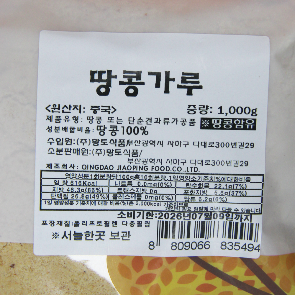 | 원재료명 및 함량(농수산물의 원산지 표시에 관한 법률에 따른 원산지 표시 포함) | 땅콩 100% |