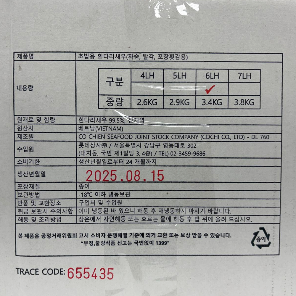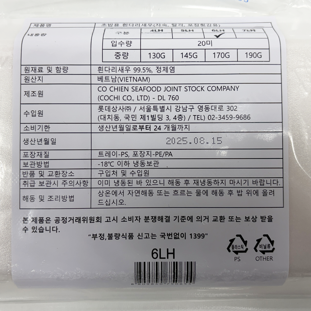 | 품목 또는 명칭 | 냉동 흰다리새우살(목초새우) 6LH 170g/롯데상사 |