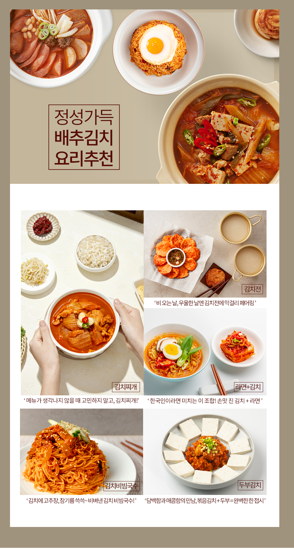 원재료명 및 함량(농수산물의 원산지 표시에 관한 법률에 따른 원산지 표시 포함) | 배추 73%(국산),무 7%(국산),정제소금 2%(국산),고춧가루 8%(중국산),마늘,양파,생강,멸치액젓,새우젓,설탕,대파,L-글루탐산나트륨,호화쌀가루 |