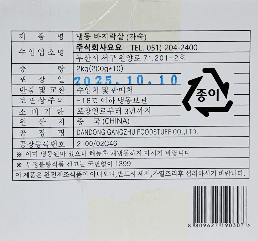 | 품목 또는 명칭 | 냉동 자숙바지락살 200g/중국산(요요) |