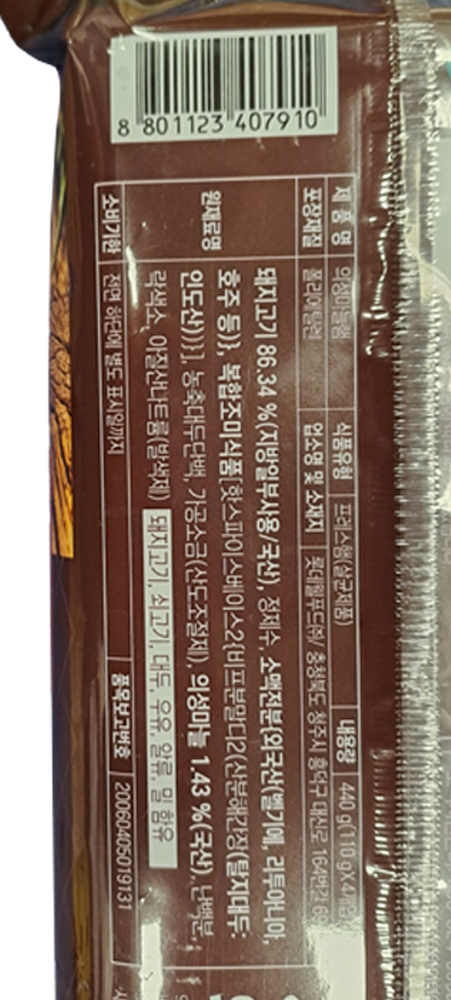 | 원재료명 및 함량(농수산물의 원산지 표시에 관한 법률에 따른 원산지 표시 포함) | 돼지고기 86.34%,(국산), 정제수, 돈지방(국산), 소맥전분(외국산등) |