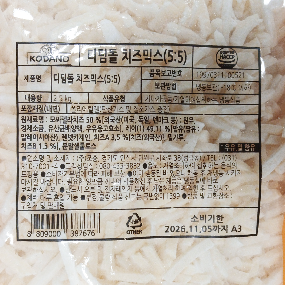 | 제품명 | 디딤돌 치즈믹스(5:5) 2.5kg(자연50%)/조흥 |